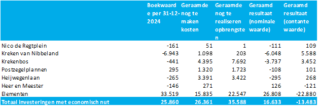 Twee complexen hebben een negatief verwacht resultaat op contante waarde, waarvoor een verliesvoorziening is getroffen. Het resultaat van het complex Heer&Meester valt per 1 januari 2025